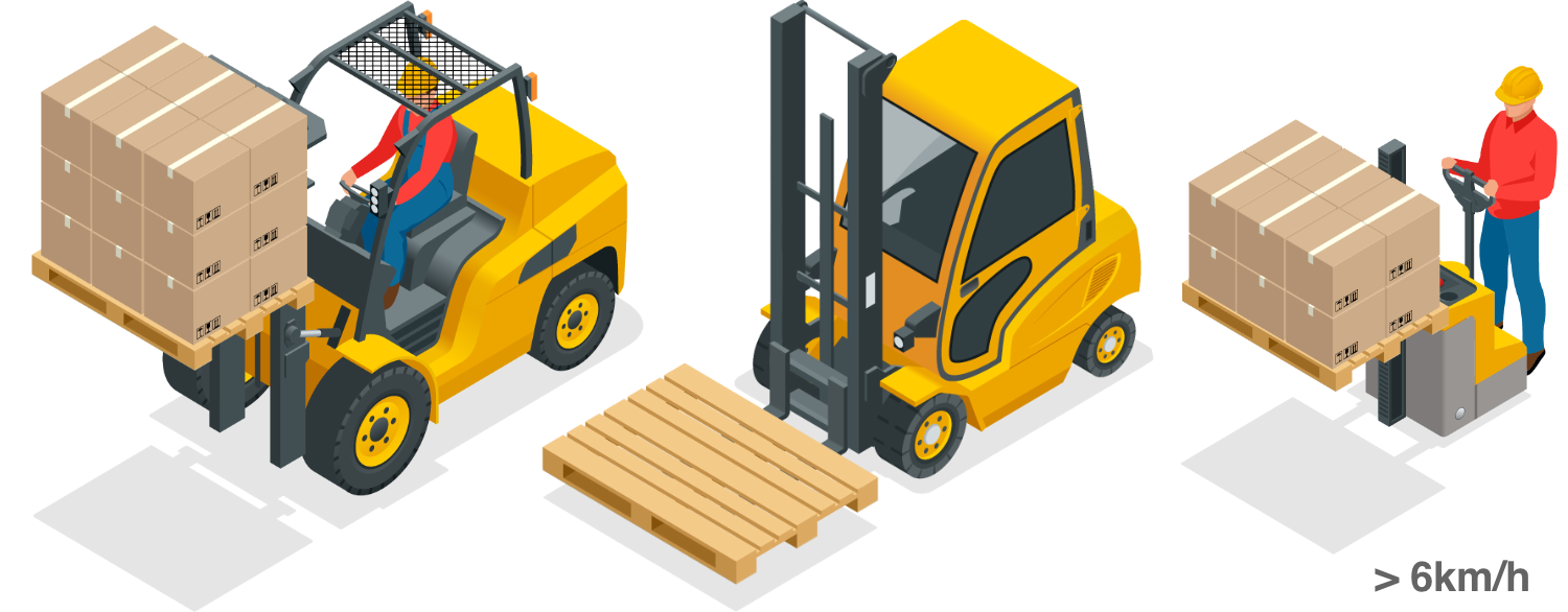 Flurförderzeuge mit Fahrersitz oder Fahrerstand sowie Mitgänger-FFZ mit Mitfahrgelegenheit > 6km/h