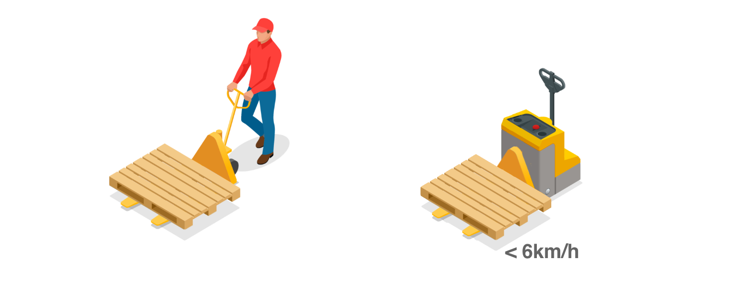 Mitgänger-FFZ, wie z.B. Handhubwagen, Handstapler oder Mitgänger-FFZ mit klappbarem Fahrerstand, die bauartbedingt höchstens mit 6 km/h gefahren werden können, dürfen unter