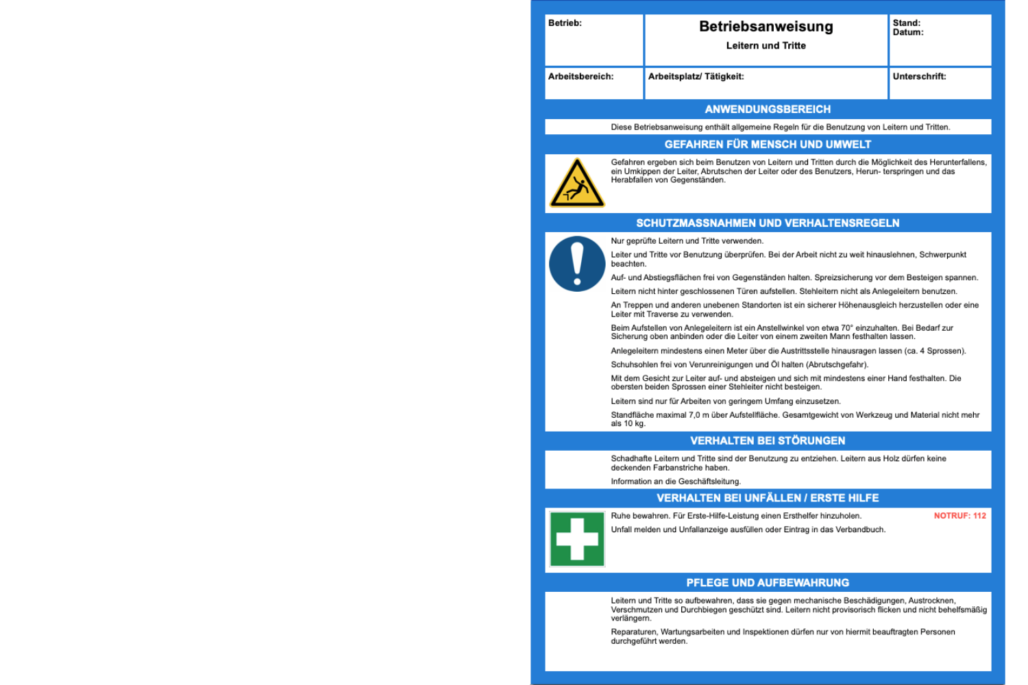 Hinweis für den Unternehmer: Es ist eine Betriebsanweisung für den Umgang mit Leitern und Tritten in schriftlicher Form zu erstellen, die alle notwendigen Angaben für eine sichere Benutzung enthält. Dabei sind insbesondere die Gefahren entsprechend der Gefährdungsermittlung sowie das Verhalten bei der Benutzung oder bei festgestellten Mängeln zu berücksichtigen. Sie können die in der Dateianlage enthaltene Betriebsanweisung verwenden und bereitstellen, sofern Sie nicht bereits über eine Betriebsanweisung zum Umgang mit Leitern und Tritten verfügen.